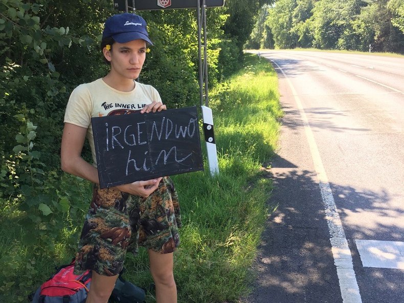 Ant Hampton & Rita Pauls (Heidelberg/Buenos Aires) / Artists in Residence. -- Der britische Performancekünstler Ant Hampton und die argentinische Schauspielerin und Autorin Rita Pauls reisen mit dem Zug, mit dem Bus und zu Fuß zur Mitte Deutschlands (genau zu der Stelle, wo der Pin auf Google Maps gelandet ist) und trampen von dort aus eine Woche lang kreuz und quer durch das Land. Mit dem wenigen Deutsch, das sie können, stellen sie den Menschen, die sie mitnehmen, eine Frage – „Was, denken Sie, sollte einmal gesagt werden?“.