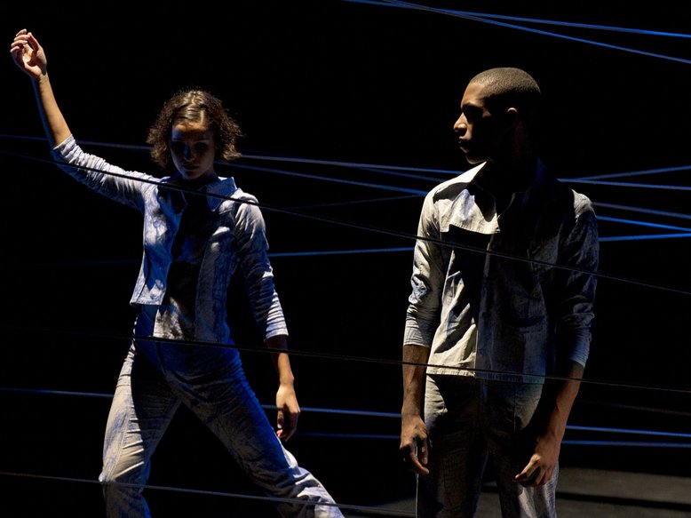 Aus einem Trio in Stille entwickelt sich in der 2011 für die Compagnie in São Paolo kreierten Choreographie „Inquieto“ von Henrique Rodovalho ein im wahrsten Sinne des Wortes verwobenes Ensemblestück. Die Tänzer*innen bewegen sich in kühlem Licht weitgehend vereinzelt, nur gelegentlich finden sie Synchronität. Zwischen ihren in jeansfarbenen Outfits gekleideten Körpern spannt sich ein Netz aus Seil. Mal Verbindung, mal Spinnennetz oder abstrakt-graphisches Gemälde. Auch die wabernden elektronischen Klänge von André Abujamra verbreiten, was der Titel suggeriert: Unruhe!