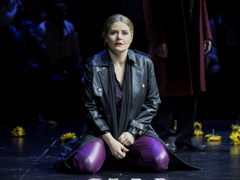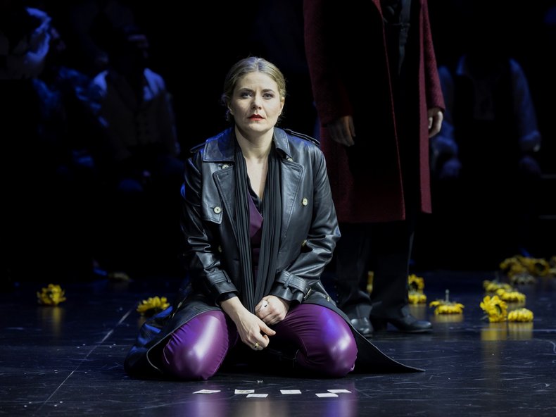 In ihrer Inszenierung setzt sich die Regisseurin Andrea Schwalbach mit dem Thema des Femizides intensiv auseinander, mit dem Versuch, dem Narrativ, dass das Opfer halb selbstverantwortlich für seinen Mord sei, zu entkommen. Carmen bekommt viele Zuschreibungen, doch bleibt sie immer ein wenig verschwommen, ungreifbar. Am Ende bleibt sie dem Blick des Mannes und seiner Gewalt ausgeliefert. Die Inszenierung spielt mit der Erwartungshaltung der Zuschauer*innen und der Figuren selbst und lässt sie das etablierte Narrativ über die femme fatale von außen wahrnehmen. Die Erfindung einer fiktiven Figur, der Conférencier, vom Gast Bariton Laurent Arcaro gespielt, bricht die vierte Wand und zwingt uns und die Figuren der Oper selbst, die Geschichte anders zu betrachten.