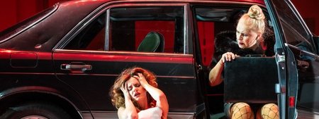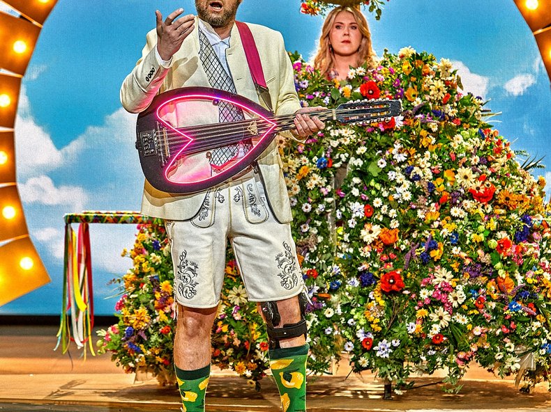 Die riesige Plastik-"Preiskuh" hängt dann zuletzt wie ein großes Rätsel und Menetekel von der Bühne herab. Und die Szene wird von Musical-Elementen beherrscht. Man hat dabei den Eindruck, dass die Kostüme von der mittelalterlichen Zunft bis zum modernsten Outfit misamt roter Zipfelmütze reichen. Das ist ein virtuoses Spiel mit der Zeit. Gelegentlich scheint die Szenerie aus dem Ruder zu laufen.