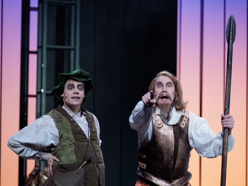 Mit Hilfe von mitreißender Musik, Fantasie und Cervantes’ vor Lebendigkeit strotzendem, optimistischem Erzählstil entfliehen sie den grauen Kerkerzellen und befinden sich auf einer aufregenden Reise, auf der Cervantes als tollkühner Ritter Don Quijote mit seinem Knappen Sancho Panza durch die Gegend reitet, bei der Windmühlen zu Riesen werden, ein Wirtshaus zu einem Schloss mutiert und sich die Prostituierte Aldonza in das Edelfräulein Dulcinea verwandelt.
