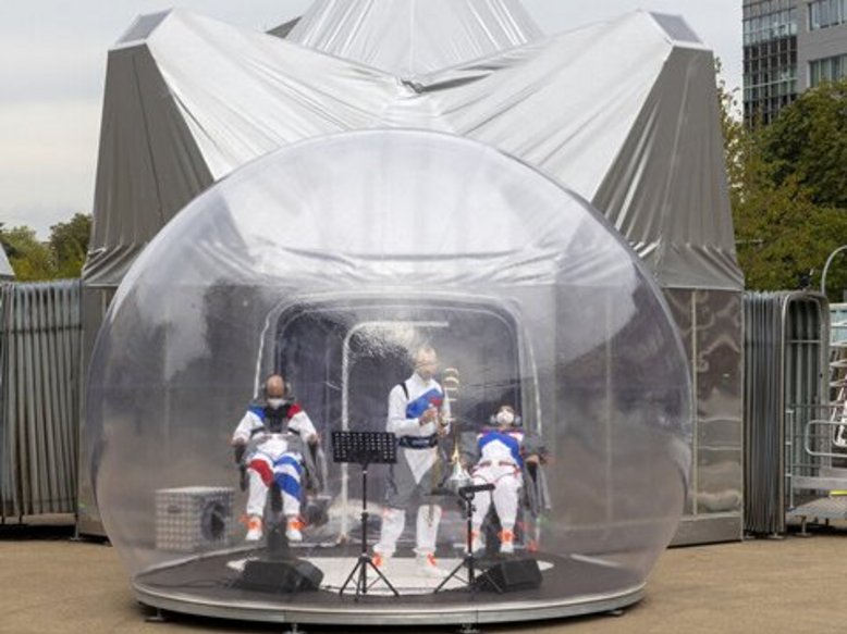 Der von raumlabor berlin entwickelte mobile Theaterraum bietet Platz für bis zu 30 Gäste. Das Architekturkollektiv, das Anfang September 2021 bei der Architektur-Biennale in Venedig für zwei seiner Projekte mit dem Goldenen Löwen ausgezeichnet wurde, hat sich für das UFO von einem Raumfahrzeug inspirieren lassen, das sich nach verschiedenen Seiten öffnet. Je nach Bedarf kann es kleinere Experimentier- und Begegnungsräume an- und abdocken, z. B. einen Bauwagen mit Tonstudio oder eine transparente Blase, so dass es vielfältige Interaktionen zwischen den künstlerischen Teams und dem Publikum ermöglicht.