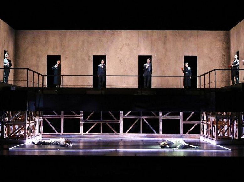 Regisseur Manuel Schmitt, der mit „Romeo und Julia“ seine erste Produktion für die Deutsche Oper am Rhein erarbeitet hat, konzentriert die von Boris Blacher auf eine Stunde verdichtete, hoch emotionale Handlung auf die beiden Hauptfiguren: Trotz größter Anziehung können Romeo (Jussi Myllys) und Julia (Lavinia Dames) nicht zueinander finden, während der von Heike Scheele entworfene Bühnenraum vermittelt, wie sehr sie von außen beobachtet und beeinflusst werden.