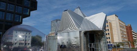 Der von raumlabor berlin entwickelte mobile Theaterraum bietet Platz für etwa 25 Gäste. Das Architekturkollektiv, das im September 2021 bei der Architektur-Biennale in Venedig für zwei seiner Projekte mit dem Goldenen Löwen ausgezeichnet wurde, hat sich für das UFO von einem Raumfahrzeug inspirieren lassen, das sich nach verschiedenen Seiten öffnet. Je nach Bedarf kann es kleinere Experimentier- und Begegnungsräume an- und abdocken, z. B. einen Bauwagen mit Tonstudio oder eine transparente Blase, so dass es vielfältige Interaktionen zwischen den künstlerischen Teams und dem Publikum ermöglicht.