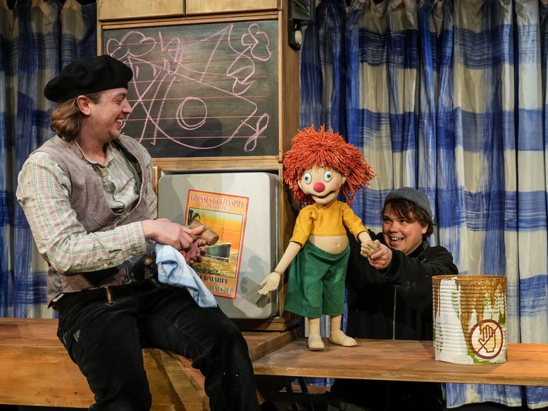 Sachen fallen herunter und Gegenstände verschwinden, was den kleinen Zuschauern aber Spaß macht. Einer Kundin wird sogar ins Bein gebissen - und es kommt Furcht vor Mäusen auf. Da hört Meister Eder ein Piepsen - und am Lehmtopf wird plötzlich ein kleiner Kobold sichtbar. Laut "Koboldgesetz" muss Pumuckl als kleiner Kobold bei Meister Eder bleiben. Die beiden werden dann aber zu Freunden, was auch im Puppenspiel gut zum Ausdruck kommt. So erinnert man sich an Geschichten von Klabautermännern, die allerlei Schabernack treiben. Man hört einen Sturm und lautes Pfeifen: "Könnte es sein, dass ihr zu Hause einen Kobold habt?" Schließlich kommt der Meister zu dem fatalen Schluss, dass an allem der Pumuckl Schuld ist. Da entsteht dann ein großes Tohuwabohu auf der Bühne. Auch der deutsche Schlager kommt überraschend zum Einsatz. So hört man Roland Kaisers "Santa Maria" und Heinos "Madagaskar"-Hymne - beide Songs erscheinen hier in einem ganz neuen Licht.
