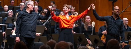 Dann waren drei Arien für Violine und Kammerorchester "Mysteries of the Macabre" aus der Oper "Le Grand Macabre" von György Ligeti zu hören (eingerichtet von Elgar Howarth, bearbeitet von Patricia Kopatchinskaja). Hier trat die Geigerin Patricia Kopatchinskaja mit Bart und Perücke als "Grand Macabre" auf, imitierte mit ihrer Violine suggestiv die Sopran-Koloraturarien. Nekrotzar ist hier zu betrunken, um den Untergang der Welt herbeizuführen, obwohl ein Komet einschlägt! Schlagwerk-Einsätze, Reihenstrukturen und Clusterbildungen gingen im Orchester nahtlos ineinander über, Ingo Metzmacher spornte die Musiker des SWR Symphonieorchesters zu spieltechnischen Höhenflügen an. Zitathafte Phrasen und ein betont rhythmischer, die Sprechmelodie nachahmender Gesang wurde von Patricia Kopatchinskaja mit höchster Virtuosität auf der Violine nachgezeichnet (SWR Experimentalstudio, Klangregie: Michael Acker).