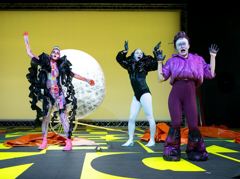 Zwischendurch braust ebenfalls ein Gewitter durch die Luft. Die wandlungsfähigen Schauspieler Tim Bülow, Camille Dombrowsky, Katharina Hauter, Sebastian Röhrle und Silvia Schwinger erleben hier den Lauf der Sonne in den unterschiedlichsten Stimmungen und Schwingungen, zwischen Glut und Glanz herrschen gleichzeitig Euphorie und Melancholie. Auch die Tränen verdampfen schließlich zu Rauch und Staub. Im goldenen Schein des Tages erwachen dann auch die Wunder der griechischen Mythologie. Die Welt der Titanen um Kronos und Rhea lebt wieder auf. Kronos, der Sohn des Himmels und der Erde, entmannt seinen Vater. Und der Himmel ist so für alle Zeit von der Erde abgetrennt. Zwischen dem göttlich-titanischen Machtwillen erscheinen ebenso die Rachegöttinnen, die Erinnyen, die von den Römern Furien genannt wurden. Und auch Ingeborg Bachmanns Gedicht "An die Sonne" findet im Programmheft Erwähnung: "Nichts Schönres unter der Sonne als unter der Sonne zu sein..."