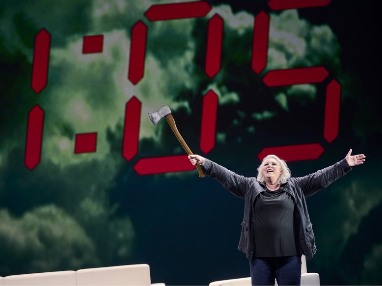 Peter Konwitschny wählt gleich zu Beginn einen ungewöhnlichen Weg - er lässt nämlich die Kinder den brutalen Vatermord in der Badewanne mit ansehen. Elektra übt gemeinsam mit dem Bruder grausame Rache an der Mutter Klytämnestra, die von Orest schließlich erschossen wird. Elektra hilft mit dem Beil nach. Im Hintergrund tickt riesenhaft die große elektronische Uhr (Bühne und Kostüme: Hans-Joachim Schlieker; Video: Signe Krogh). Der Himmel verwandelt sich in ein dunkles Weltall, ein Sternenzelt voller ungeheurer Geheimnisse. Elektra verzichtet zuletzt auf ihren mänadischen Tanz, liegt erschöpft am Boden. Im Hintergrund erkennt man ein gewaltiges Feuerwerk, hört pausenlos das Rattern von Maschinengewehren. Zwischendurch sieht man den blutüberströmten Leichnam Agamemnons aus dem Bad steigen, den der Schauspieler Peer Oscar Musinowski eindringlich darstellt. Ein verblüffender Einfall. Er berührt sogar Klytämnestra, die mit Elektra eine furchtbare Auseinandersetzung hat.