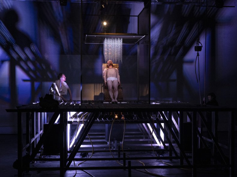 Der Folterapparat entwickelt sich so zu einer archäologischen Stätte der Blicke. In dieser skurrilen Echokammer wird die bürokratische Welt ad absurdum geführt. Die Verantwortung des Blickes und der Zeugenschaft einer Exekution rücken gnadenlos in den Mittelpunkt. Der Apparat, den man auf der Bühne sieht, ist inspiriert von historischen Guillotinen aus Holz. Und der Bühnenbildner Pavel Svoboda hat den Unterbau selbst eingerichtet. Darauf steht eine große Box aus Plexiglas. Sie erinnert an David Lynchs Fernsehserie "Twin Peaks". In dieser Box befindet sich eine Konstruktion, die an einen elektrischen Stuhl erinnert. Bei Kafka spielt das Motiv von Passion und Opfer in jedem Fall eine große Rolle. Das kommt in dieser Inszenierung in wirklich bewegender Weise zum Vorschein. Bilder von Kreuzigung und spiritueller Verklärung rücken dabei immer mehr in den Mittelpunkt.