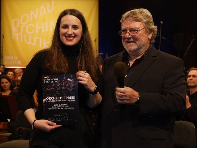 "Ding, Dong, Darling!" für Orchester und Elektronik (2024) der 1991 in Zagreb geborenen Komponistin Sara Glojnaric hinterließ als weiterer Kompositionsauftrag des SWR ebenfalls einen hervorragenden Eindruck. Der Dirigent Vimbayi Kaziboni verstand es ausgezeichnet, die in unendlichen Staccato-Attacken gefangenen Klangflächen zu aktivieren. So wurden diese explosiven Stimmungsbilder immer mehr angeheizt. Es ist ein ungewöhnliches Stück über "Queer Joy". Popkultur, Online-Slang und der moderne Internet-Diskus werden gleichsam paraphrasiert. Das Stück beschreibt, wie Chappell Roan offen über ihre Sehnsucht nach anderen Frauen singt. Hier agieren überwiegend schwarze Frauen und Trans-Frauen. Freude und Vergnügen im Leben von LGBTQ+Personen soll dabei geschildert werden. Dies gelingt der Komponistin Sara Glojnaric sehr eindringlich und ausdrucksstark.