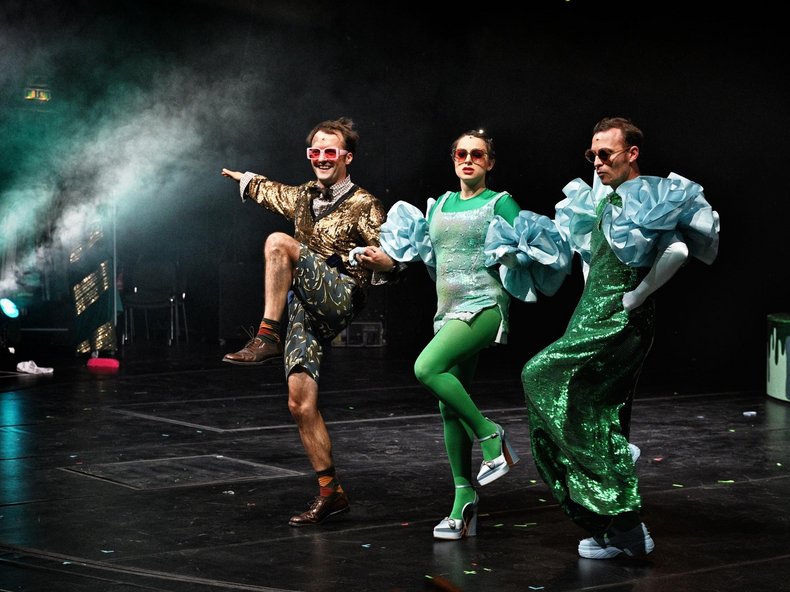 Die Bühne und die Kostüme von Elisabeth Vogetseder erscheinen in der gewitzten Regie von Elena Tzavara und Sarah Ritter im "Pariser und Schweinfurter Grün" - der berühmten Modefarbe des 19. Jahrhunderts, die für Arsen-Vergiftungen sorgte, Dr. Khranich erinnert sich nostalgisch an Omas heiße Schokolade. Und in seiner Jugend haben alle den Kaffee schwarz getrunken. Nach dem "Walzer Text" kommt es zur "Drachenlied-Reprise". Und "Der Dalmatiner. Variationen über einen Flachwitz" lässt den Musikwissenschaftler zu einem kläffenden Hund werden, der nicht nur beim "Blues" hin und her kriecht.