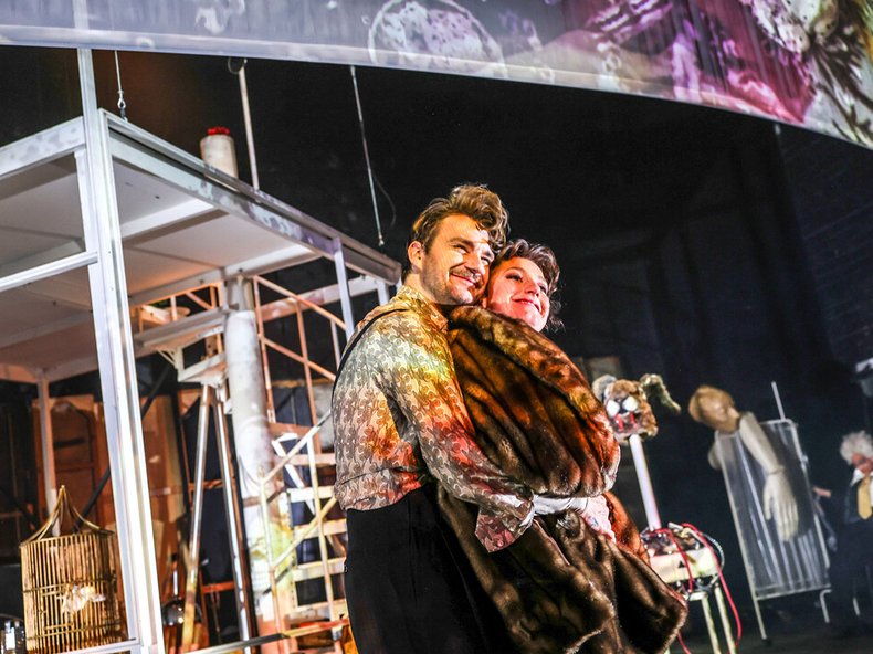 Dem Bühnenbild hätte etwas mehr von der Ästhetik der bezaubernden Videos (beides Stefano Di Buduo) gut getan. Wesentliches Element des Buches ist ja nicht nur das Verschwinden von Einrichtungsgegenständen (die in dieser Inszenierung nur zum Haufen zusammengerückt wurden) aufgrund der zunehmenden Verarmung Colins, sondern es geht um die Versinnbildlichung durch die immer enger und klammer werdenden Räume, die eine zunehmende gefährliche Bedrängnis und Bedrückung ausdrücken sollen. Vom Luxus zur Armseligkeit, das spiegelt sich nicht so richtig wider. So kommt auch leider die Komponente der unheimlichen Atmosphäre nicht zum Tragen.