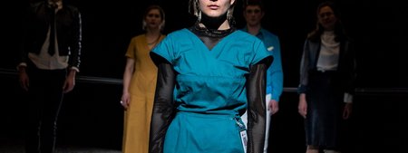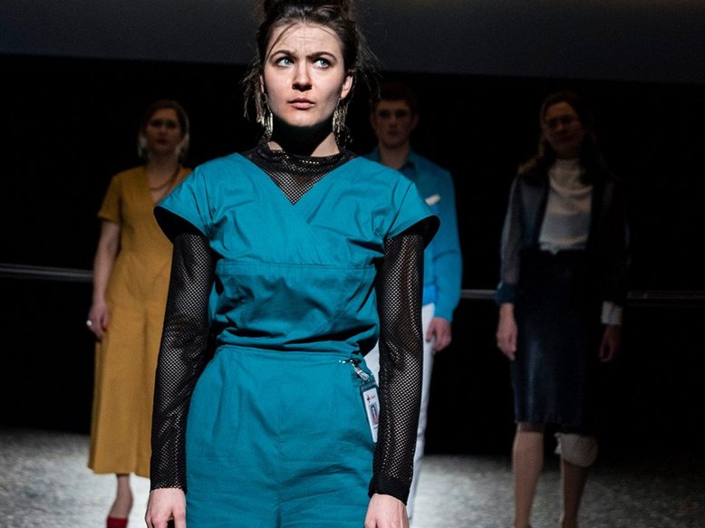 Die Zuschauer*innen bewegen sich während des Theaterstücks mehrere Stockwerke durch das Treppenhaus und auch per Aufzug durch das Gebäude. Die Gänge sind zum Teil eng geschnitten.