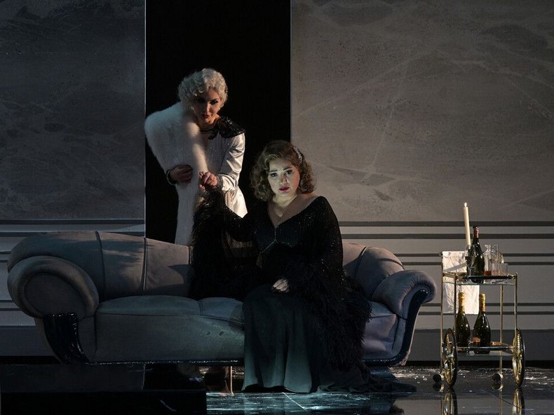 Die Verortung in diese Zeit macht Sinn, denn das Thema der Oper und Ciléas Musik selbst haben etwas Filmmäßiges. Beim rauschenden Fest im dritten Akt wird dann noch einmal die ganz große Show aufgefahren: Glitzer, Pailletten, tiefe Dekolletés mit überdimensionierten Brüsten. Falaschi zeigt aber auch in kleinen Szenen Abhängigkeiten, die entstehen können, wenn man Karriere machen möchte. Auch die einzelnen Charaktere werden adäquat dargestellt. So ist etwa Alexey Zelenkov als Michonnet zunächst genervt über die Anforderungen seiner Schauspieltruppe, aber berührend in seiner zurückgehaltenen Liebe zu Adriana. Am Ende zeigt der unbekümmerte Narzisst Maurizio seine wahre Haltung: als Adriana im Sterben liegt, zieht er sich lieblos zurück, Adriana stirbt allein.