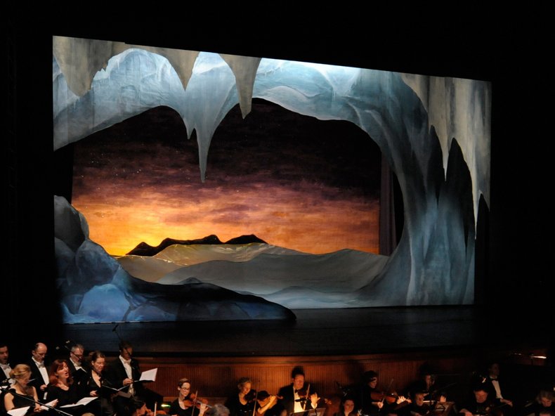 Im ersten Bühnenbild sieht man Wellen zwischen Felsenlandschaften. Und die suggestive Musik untermalt das Geschehen in harmonisch weitschweifigen Bewegungen. Das andere Bühnenbild erinnert an eine Tropfsteinhöhle, deren geheimnisvoller Hintergrund auf eine gewaltige Landschaft weist, an deren Firmament die Sonne glänzt. Aber es gibt auch Bühnenbilder, wo es in einer Waldlandschaft schneit und wo ein brennender Scheiterhaufen in einer monumentalen Gebirgslandschaft lodert: "Du bist das Licht der Welt..." Blitze zucken, ein Gewitter deutet sich an.