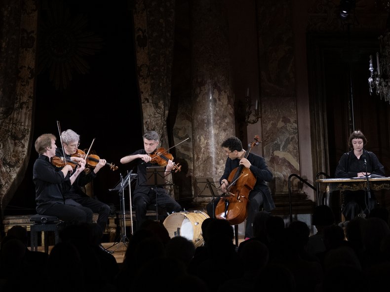 Musik und Wort gingen auch bei den anderen Werken nahtlos ineinander über. "Neutral Objects" von Yaz Lancaster erschien ebenso flirrend wie hypnotisch und besann sich auf Alltägliches. Rhythmische Finessen blitzten bei "Little Black Book" von Jlin und "love reacts only" von Inti Figgis-Vizueta hervor. Besonders interessant war die suggestive Begegnung von "The Answers" von Julie Zhu, in der vier Instrumente vier Planeten vertonen. Die erste Geige stellt Mars dar, die zweite die Erde, die Bratsche Venus und das Cello Merkur. Hypnotisch wird tonal das C2 umkreist. In die kontrapunktisch reizvolle Welt des Madrigals entführte Maddalena Casulana bei "Il vostro dipartir", wo das Quartett die thematischen Zusammenhänge minuziös offenlegte.