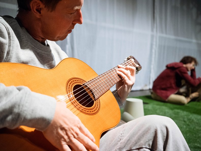 Die Textfassung ist im Probenprozess mit den Schauspieler*innen und im Austausch mit Bewohner*innen eines Seniorenheims entstanden. Projektionen von diesen Gesprächen brechen das Stück immer wieder auf und stehen parallel zu den Sorgen, Nöten und Freuden der Figuren.