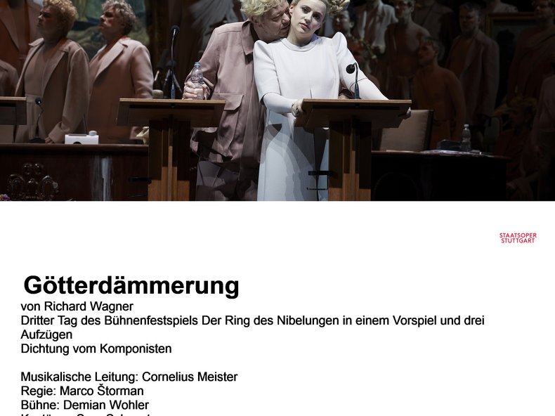 Ihre Zusammenkunft ist von kindlicher Unschuld geprägt, nihilistische Komponenten fehlen nicht. Die Inszenierung mit ihren Schluchten und monumentalen Gebäuden wirkt oftmals futuristisch und klassizistisch. Die Gibichungenhalle mutiert zu einem grotesken Komplex, der halb Kirchenkathedrale, halb Gerichtssaal und Parlament zugleich ist. Im Vordergrund steht sogar ein Podium mit Mikrofonen, in die die Protagonisten hineinsprechen. Das Nebeneinander verschiedener Schichten ist hier auffallend, es fällt immer wieder der schwarze Vorhang. Das Zersplittern von Erzählungen hat für Marco Storman eine große Bedeutung. Bei ihm liegt die Apokalypse schon hinter dem eigentlichen Geschehen, denn die gesellschaftlichen Verabredungen funktionieren hier nicht mehr.