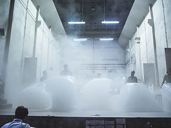 Und so öffnet die Denkfabrik des Sokrates, in der Thom Luz‘ Stück angesiedelt ist, nun filmisch vorab einen Spalt breit ihre Tür und zeigt, wie die Denk- und Wolkenbildungsprozesse auf und hinter der Bühne flüchtige Gestalt annehmen.
