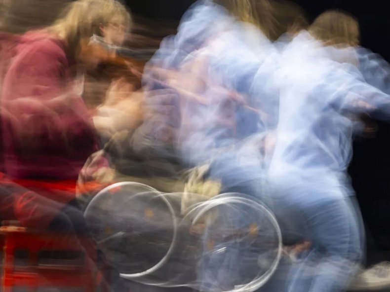 Mit unserer Performance geben wir ihnen eine Stimme: Auf der Bühne entsteht ein Kaleidoskop der Zeitwahrnehmungen, das uns tiefer in die Logik des Zeitmangels blicken lässt. Choreografierte Erschöpfungsmomente treffen auf Oasen der Fürsorge. Zeitfresser werden klein gesungen. Momente für die Ewigkeit werden bis zur Atemlosigkeit heraufbeschworen. Die Uhren ticken mal laut, mal leise, gehen manchmal schneller und dann wieder langsamer.