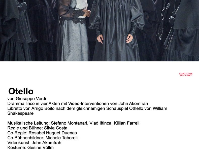 Die Kostüme von Gesine Völlm bevorzugen die Schwarz-Weiß-Zeichnung. Desdemona bleibt passiv und naiv, ist den Launen des eifersüchtigen Otello schutzlos ausgeliefert. Desdemona ist hier auch nicht nur Heilige und Mutterfigur. Die Gegenstände sind in dieser Inszenierung dazu da, die Körper der Sänger zu skulpturieren. Die Licht- und Farbregie spielt hier virtuos mit Licht und Schatten, Helligkeit und Dunkelheit. Dies gelingt nicht immer gleich überzeugend. Es gibt auch Tänzer, die Otello und Desdemona in ihren Zweierszenen verdoppeln. Sie leben die unmögliche Umarmung aus, die den beiden verwehrt ist. Das Venezianische erhält ebenfalls eine recht starke Bedeutung, die Riten der katholischen Kirche werden vor allem bei den Chorszenen subtil herausgearbeitet. So sieht man viele schwarze Kreuze, die das spirituelle Geschehen prägen.