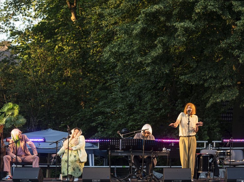 In der über die letzten (Corona-) Monate hinweg entstandenen, musikalischen Stückentwicklung »Fliegende Bauten« müssen die Figuren auf dem Weg nach Hause zunächst zu sich selbst finden. In einer fiktiven Wohnbaubehörde treffen sie als Wohnungslose und -suchende, Mietaktivisten und einsame Hochhausbewohner auf der Suche nach einem echten Zuhause aufeinander. Je nach Lebenssituation unterscheiden sich die Wünsche und Sehnsüchte der Figuren. In surreal erscheinenden Musiksequenzen erzählen sie von sich und ihren Wohnträumen. Da wird die eigene Wohnung besungen wie eine Geliebte oder romantischen Melodien wird die unbarmherzige Alltagsbeschreibung eines Obdachlosen entgegengesetzt. Mit ihren musikalischen Einfällen durchbrechen die Figuren immer wieder die lethargische Wartesituation in der Behörde, die von einem mysteriösen Beamten geführt wird.