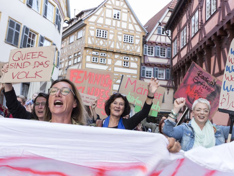 Alle drei Jahre richtet die Stadt Esslingen a.N. das große Kulturfest „Stadt im Fluss“ aus. Zur diesjährigen sechsten Ausgabe des Festivals ziehen Künstler*innen und Vereine in das Alte Rathaus ein und besetzen repräsentative Orte der Stadt mit ihren Ideen zur Umverteilung von Privilegien und einer gerechten Stadtgesellschaft. Auf einer Bühne im Freien, in einem Parlament, in der matriarchalen Volksküche, dem Gesundheitszentrum oder der Schule der Frauen* geht es um Gemeinwesen: z.B. um Pflege, um Gewaltfreiheit, um Geschlechtervielfalt, um Gesundheit, um die Sicherheit von Daten – und in der Nacht ums reine Vergnügen!