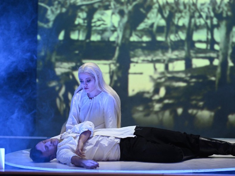 Auf der Bühne sieht man dann tatsächlich, wie Rusalka wie ein Irrlicht umherschwirrt. Die Hexe fordert sie auf, den Prinzen zu töten, dann hätte sie ihren verlorenen Frieden wieder. Der in Schwermut verfallene Prinz sucht nun wieder nach Rusalka, die plötzlich aus den Fluten auftaucht. Doch er lässt sich nicht davon abhalten, sie zu küssen, obwohl sie ihn gewarnt hat. Er sinkt dann tot zu Boden.