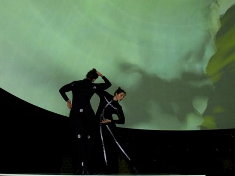 Im Zentrum dieser „Full-DomeShow“ bleibt aber der live agierende Mensch in Form von vier Tänzern auf einer Bühne, die sowohl die immersive Musik, als eben auch den Live-Videooutput füttern und durch Bewegungen steuern.