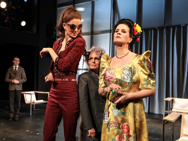 Bühnen- und Kostümbilder dazu entwarf Kristopher Kempf und Schauspielkapellmeister Olav Kröger begleitet die Vorstellungen live am Cembalo. In den Rollen spielen Mechthild Scrobanita als Frau Margot, Sabine Schramm als Frau Imelda, Alexandra Sagurna als Frau Leïla und Sebastian Schlicht als Gottfried.