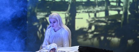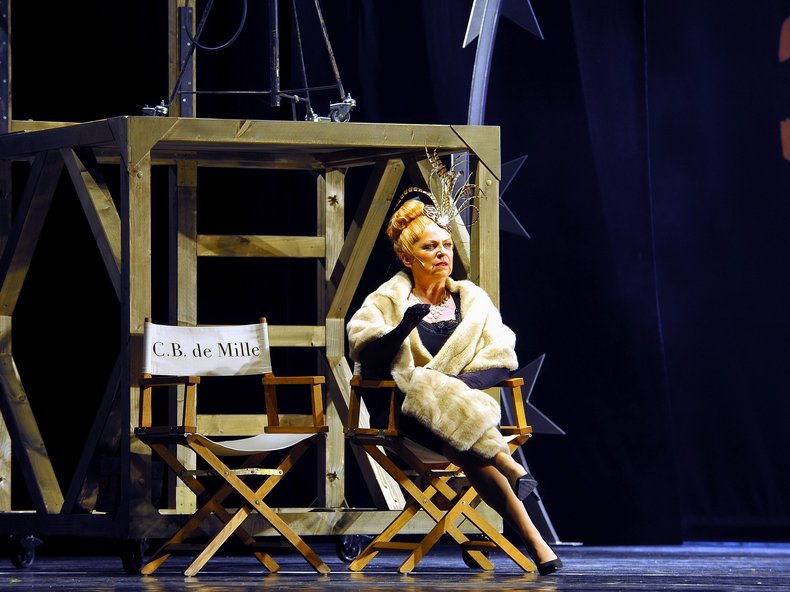 In der Inszenierung sieht man aber auch goldene Brokatfassaden und riesige Vorhänge. Schweinwelt und Realität werden so plastisch beleuchtet. Ein kurz zuvor verstorbener Schimpanse wird bestattet. Norma zeigt Joe das Drehbuch zu ihrem Film "Salome". Sie träumt fieberhaft von einem Comeback als großer Filmstar. Gleichzeitig bekommt sie ständig Fanpost, die jedoch in Wahrheit von ihrem früheren Ehemann Max von Mayerling verfasst ist, der sie in ihrem Film-Wahn bestärkt. Joe gerät nun immer tiefer in die Abhängigkeit von Norma Desmond, die sich in ihn verliebt hat.