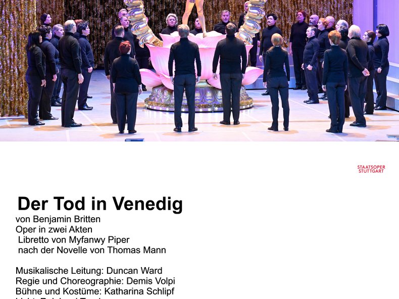 Als sich alles zur Abreise rüstet, beobachtet Aschenbach Tadzio und andere Knaben noch einmal beim Spiel. Als der Knabe bedrängt wird, will ihm Aschenbach helfen - doch es fehlen ihm die Kräfte. Er stirbt an der Cholera. Das Libretto von Myfanwy Piper hat die zuweilen aufgeschwemmte Erzählung Thomas Manns schlanker gemacht. In dieser Koproduktion der Oper Stuttgart mit dem Stuttgarter Ballett überzeugt auch die musikalische Leistung mit dem famos musizierenden Staatsorchester Stuttgart unter der einfühlsamen Leitung von Duncan Ward. Bühne und Kostüme von Katharina Schlipf lassen das Geschehen in Zeitsprüngen Revue passieren. Die Tonalität dieses Werkes dominiert bei der Wiedergabe deutlich, einzelne Motive erhalten eine überragende Bedeutung.