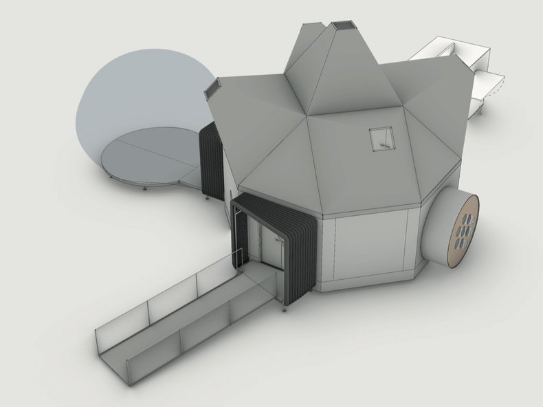 Das UFO, ein mobiler Theaterraum für etwa 30 Gäste, wurde von raumlabor berlin entwickelt. Das Architektenkollektiv um Jan Liesegang arbeitet an den Schnittstellen zwischen Architektur, Stadtplanung und künstlerischer Intervention mit der Vision, den städtischen Raum positiv verändern zu können, neue Atmosphären und ein Gefühl für Potentiale und Freiräume zu schaffen. Für das UFO hat es sich von einem Raumfahrzeug inspirieren lassen, das sich nach verschiedenen Seiten öffnet. Je nach Bedarf kann es kleinere Experimentier- und Begegnungsräume an- und abdocken, z. B. einen Bauwagen mit Tonstudio, so dass es vielfältige Interaktionen zwischen den künstlerischen Teams und dem Publikum ermöglicht.