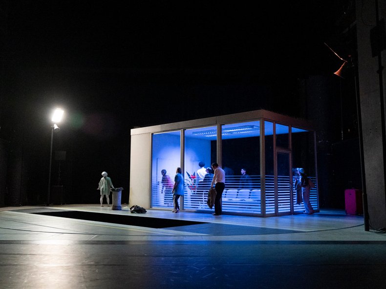 „Der Bahnhof“ ist normalerweise ein Ort, an dem Emotionen zurückgehalten und verborgen werden; hier wird er zur Landschaft, in der sie sich ihren Weg zu ungewöhnlichen Ausdrucksformen bahnen. In diesem paradoxen Zustand werden die vermeintlichen sozialen Gesetzmäßigkeiten dieser Orte hinterfragt sowie die Beziehung zu uns selbst und zu den Menschen um uns: Wie sind wir mit Anderen verbunden, selbst wenn wir es im Alltag nicht wahrnehmen? Das Auftauchen eines Outsiders stellt schließlich die Trennung zwischen Realität und Darstellung komplett in Frage. Der Abend ist ein Spiel mit Zeitlichkeit, mit dem Wechsel zwischen Innen- und Außenperspektive, zwischen skurriler Komik und tragischem Ernst.