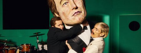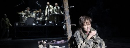 Auf der Bühne steht ein riesiges Bühnenbild aus verschiedenen Metallelementen. Darauf verteilt sich das Ensemble in verschiedenen Posen.