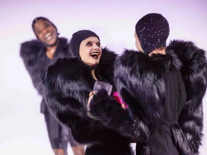 Nach anfänglichem Fremdeln entsteht zwischen ihnen ein Dialog aus faschistischer Besessenheit, dem deutschen Grundgesetz und seinen katholischen Wurzeln sowie Rüstungsberichten der Bundeswehr, der in einer dystopischen Vision eines "Neuen Deutschlands" kulminiert, das vermutlich schon längst im Argen liegt. Erniedrigung und Erhebung des Einzelnen, Gewalt, die Suche nach menschlicher Nähe und Schutz, zuallerletzt aber die Frage nach dem Wesen der Menschenwürde werden bei diesem unfreiwilligen Leder-Stammtischs besprochen, durch den Raum gejagt und zerlegt.