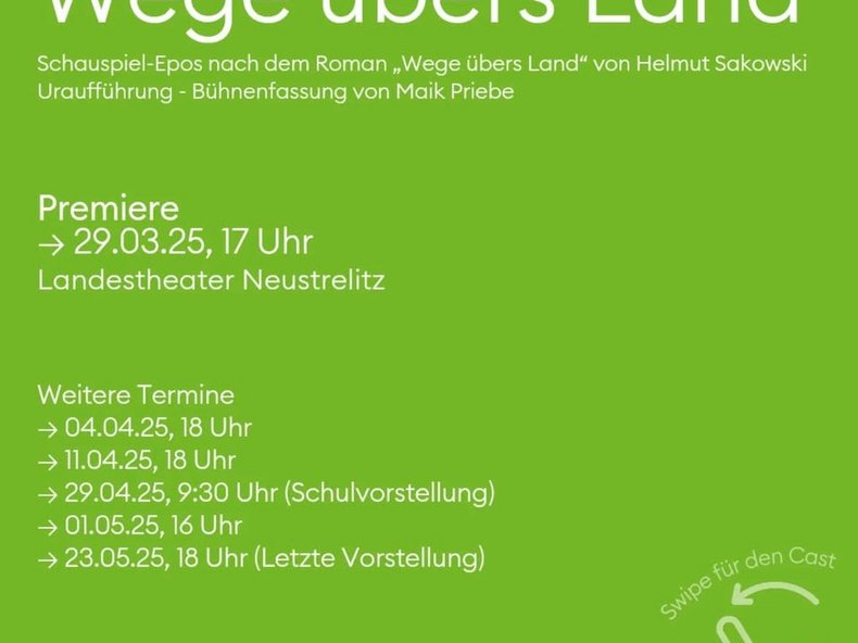 „Wege übers Land“ ist ein bildmächtiges Epos, die Verfilmung mit Ursula Karusseit legendär. Schauspieldirektor Maik Priebe bearbeitet Helmut Sakowskis Roman erstmals für das Theater.