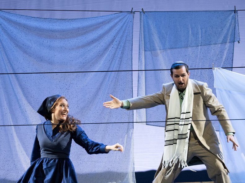 Die Kostüme, von Sarah Rolke kreiert, sind eher neutral ohne irgendeine zeitliche Verortung in Blau- und Brauntönen, mit Anklängen an die typische Kleidung der frommen osteuropäischen Juden, die Kleidung des Wachtmeisters mit Anklängen an die Nazi-Uniform. Für das Bühnenbild hat Nikolaus Webern eine überzeugende Symbolik für die Fragilität des Daseins gefunden. Es gibt keine gebaute Dorfkulisse. Das Dorf, setzt sich aus weißen Wäschestücken, an Leinen gehängt, zusammen. Es entsteht beim Auftreten der Dorfbewohner und verschwindet mit dem Abnehmen des letzten Tuches beim Verlassen des Dorfes, wenn die Bühne leer zurückbleibt. Ebenso überzeugend ist die Lichtsetzung von Volker Weinhart. Wenn der Milchmann Tevje im Zwiegespräch mit Gott ist, den er um etwas bittet, um Rat fragt, kritisiert, mit dem er diskutiert, fällt ein Lichtspot auf ihn, alle um ihn herum fallen ins Dunkel, bleiben in der Bewegung verharrend und stumm. Auch die Musik setzt dann aus. Das sind sehr berührende Momente.