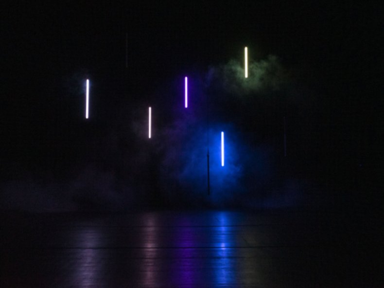 Die Stimmen der Oberhausener Theatermitarbeiter:innen treffen auf eine Choreografie der Bühnenelemente. Per Video geht es hinter die Kulissen, während auf der Bühne Wolken vorüberziehen, ein Donnergrollen kommt und geht und Blitze tonlos aus der Ferne leuchten. So entsteht eine Hommage an das Theater von der Bühne aus und zugleich eine Erzählung über die Arbeitswelt und ihre Veränderung.