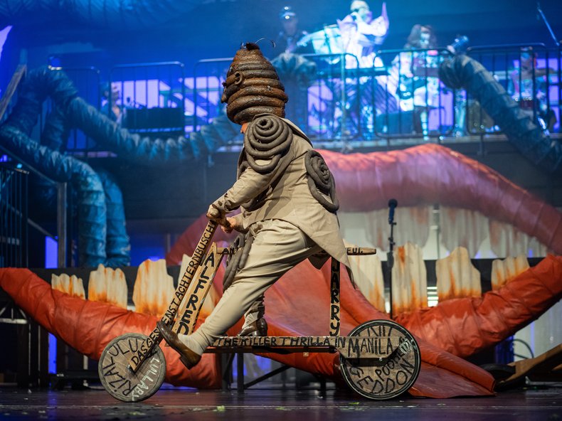 Die SMAK!-Show beginnt also mit „Schreiße“, nicht weniger als 100 „Akte“ in fast pausenlosen drei Stunden werden auf der ständig mit allerlei Texten flackernden Übertitelanlage aufgezählt. Ein Viertel davon sind die Songs von Khavn, die Musik dröhnt derweil fast immer laut und bald monoton – aber ja, es soll ja auch eine Oper sein, wie man im Programmheft liest. Überhaupt das Programmheft: Die auftretenden Figuren haben dort allesamt einen hübschen sinnfreien Lebenslauf zusammenschwadroniert bekommen, der das richtungslose Gewaber auf der Bühne keine Spur aufwertet. Es gibt Entzückendes wie den Aufputz der vielen Kinder und kleinwüchsigen Schauspieler, es gibt Vulgäres wie die ausufernd vielen Zoten und Schaumstoffgenitalien oder den auf Lilith Stangenbergs Kopf ausgeleerten Kübel Kacke, es gibt Beeindruckendes wie Bituin Exscalante, die sich in der Rolle „Mamamakbeth“ als formidable, authentische, tolle Sängerin entpuppt. Und es gibt gähnende Langeweile, weil der gut geölte und bebilderte Leerlauf einfach keine Substanz finden mag, keine Aussage, keinen Daseinsgrund. Auch die zahlreichen Zitate von Künstlern und Diktatoren und erst recht die vielen Übertitel können da nicht helfen. Daniel Zillmann als Ulbulbulul scheint den ganzen Abend nicht besonders ernstzunehmen, selbst Lilith Stangenberg, die sich wie immer existenziell-intensiv reinhaut, wird in ihrer Kraft und mal wieder stupenden Präsenz immer wieder alleine gelassen.