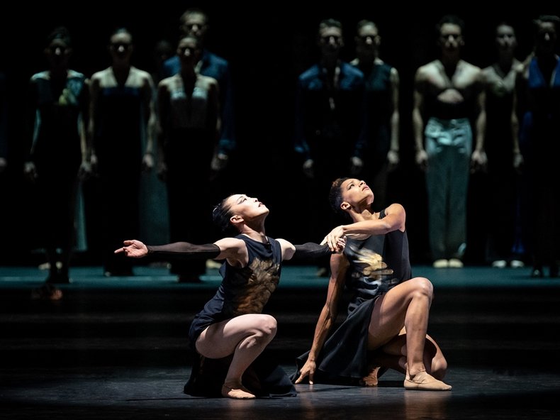Martin Schläpfer antwortet diesem intimen Kammerspiel Hans van Manens mit einem großen Ballett, das er allen Tänzerinnen und Tänzern seines Ensembles widmet. Schlicht 4 nennt er seine Uraufführung zu Mahlers 4. Symphonie, die ihn mit ihrer hintergründigen Schönheit, ihren gefährdeten Idyllen, aber auch ihrem bösen Humor, ihren scharfen Tönen und ihrer drastischen Schilderung eines ganz und gar nicht himmlischen Paradieses zu einem tänzerischen Welttheater inspirierte. Mahlers Dramaturgie der Brüche und Verwerfungen aufgreifend entfaltet Martin Schläpfer kaleidoskopartige Bilder des Menschen, voller Sehnsucht, Ausgesetztheit und Verlorenheit, traumentrückt oder sich an den großen Fragen des Lebens reibend – Szenen wie Inseln eines gewaltigen Archipels untergründig miteinander verbunden.