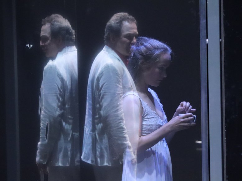 Die VR-Artists und FAUST-Preisträger Jan Schulten und Tobias Bieseke bringen in Videosequenzen die KI auf die Bühne. Während ihre Videokunst mit Hilfe von VR-Brillen bei „Wann, wenn nicht jetzt?“ das Publikum in den Friedenssaal entführten, schaffen die beiden VR-Künstler Metaebenen mit Hilfe von Videoprojektionen. Tobias Bieseke erklärt seine Arbeit wie folgt: Die Videoebene des Meta-FAUST ist eine Matrix, die von einer künstlichen Intelligenz (KI) durchdrungen ist. Dieses tief verzweigte Wurzelsystem isoliert Faust nicht vollständig in seiner Geschichte, sondern lässt ihn mit unserer Welt interagieren. So dringt die KI durch Spiegel, Fenster und Türen in die Bühnenwelt ein und erzeugt mittels ihres Algorithmus eine Zwischenwelt, die versucht, Gedankliches aus den Figuren herauszulösen und zu projizieren. Um dies zu unterstützen hat Ausstatterin Annette Wolf neben einer magischen Spiegelwelt auf der Bühne auch intelligent leuchtende Kostüme erschaffen.