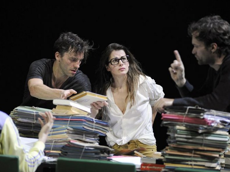 Die Unruhe, das Getriebensein findet in Richters Inszenierung in einer ständigen Bühnenbewegung Ausdruck. Zahlenreihen rattern auf der Bühnenhinterwand, Metronome klicken an gegen den Bass des Sounds von Ben Frost, Videoschirme zeigen heutige Katastrophennachrichten. Das sind Bilder für unseren gegenwärtigen Wahnsinn. Die sieben Schauspieler kommen nie zur Ruhe. Und Woyzeck muss ständig sinnlos Stühle rücken. Szenisches Spiel wechselt mit Vortrag, und unversehens ist man in den Büros der Aktivisten mit ihren Zettelbergen gelandet.