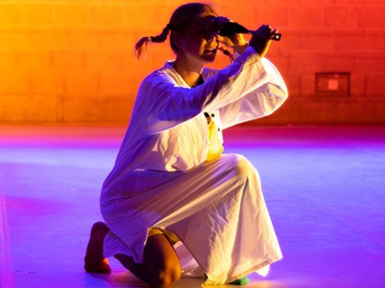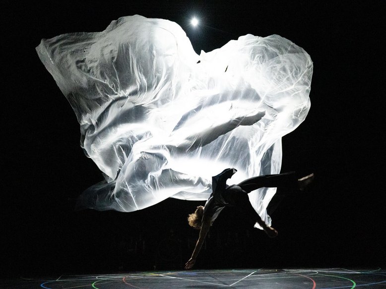 Ein Wesen in silbern schimmerndem, folienartigem Gewand, der ganze Körper von Kopf bis Fuß verhüllt, bewegt sich aus dem Dunkel auf die Bühne. Es herrscht Stille und das Wesen erkundet langsam, fast…