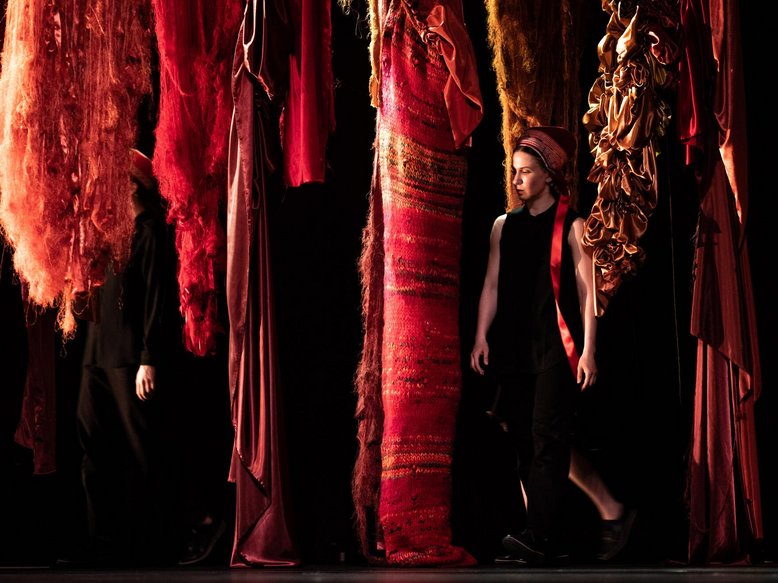 Drei Tänzerinnen in schwarzer Kleidung mit Hauben, die den ganzen Kopf bedecken und nichts erkennen lassen, die die Identität verbergen. Am Rande der Bühne liegen golden glitzernde Stoffe. Und schon…