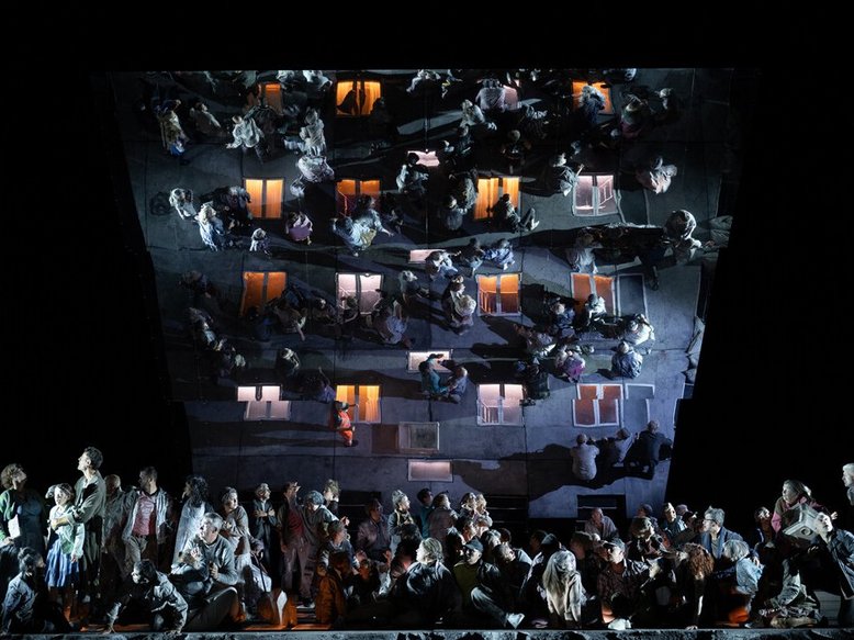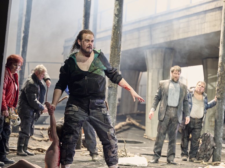 In der zerklüfteten Inszenierung von Calixto Bieito (Bühne: Susanne Geschwender; Kostüme: Merce Paloma) liegt die Apokalypse schon hinter uns, die Brücken sind eingestürzt, die Menschen kämpfen…