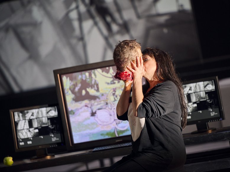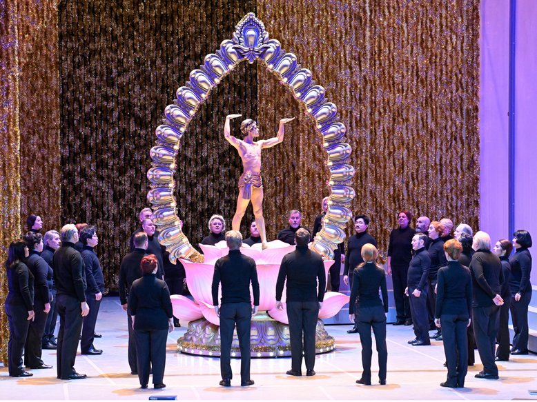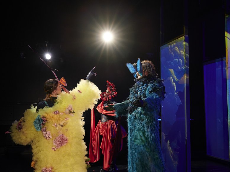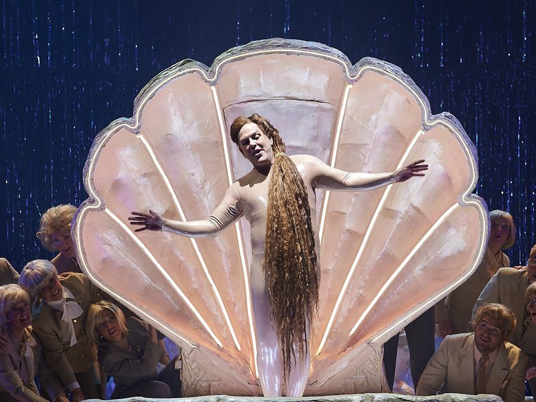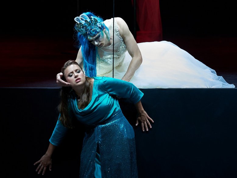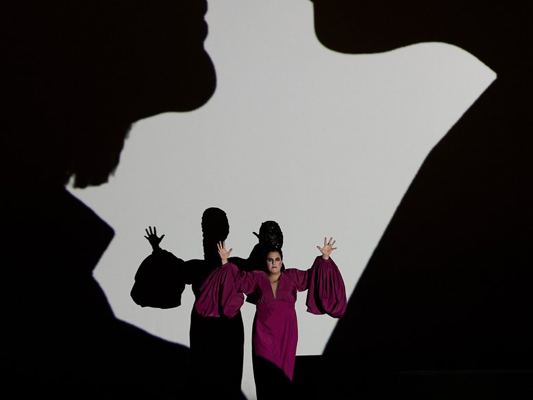 Als Show mit moderner Synthesizer-Musik präsentiert die Regisseurin Olivia Hyunsin Kim im weiträumigen Bühnenbild von Leo G. Alonso (Kostümbild: Nadine Bakota/Mateusz Bidzinski) Henry Purcells…