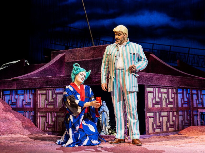 In der Regie von Hendrik Müller wird die Handlung gleich zu Beginn in die Zukunft versetzt. Da erscheint plötzlich der Marineleutnant der USA Pinkerton als Astronaut, der auf der Erde landet und die…